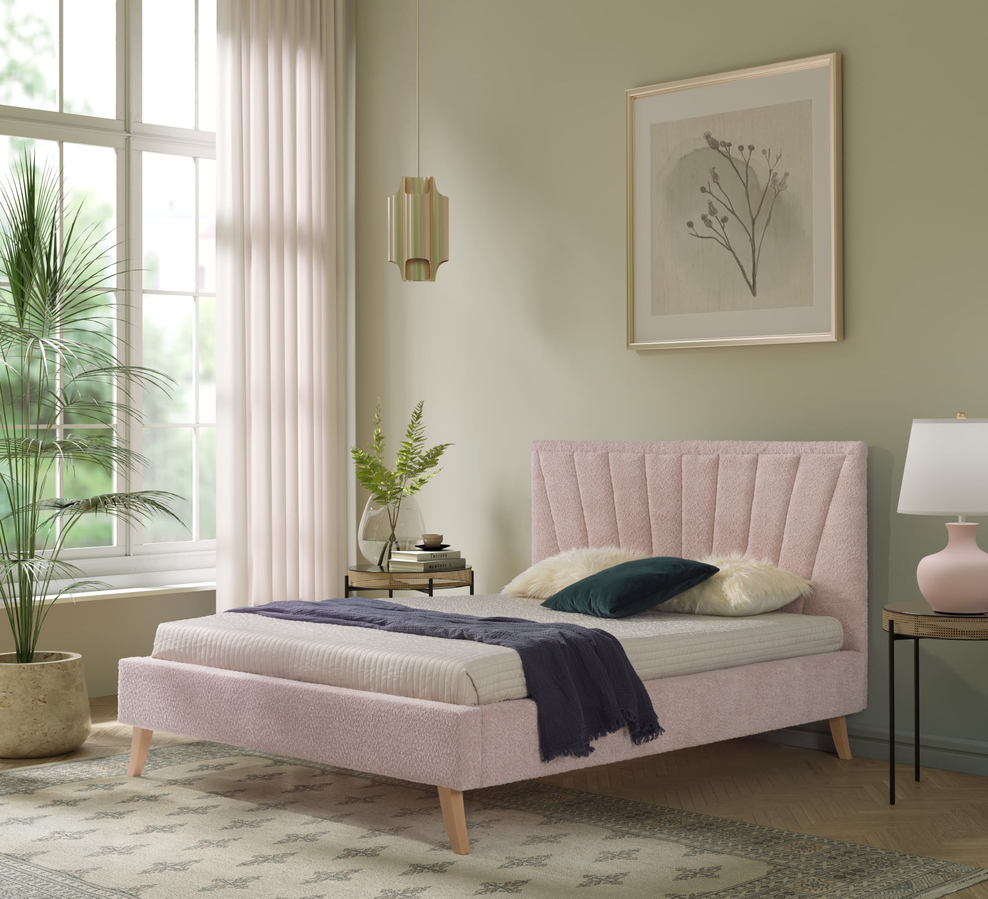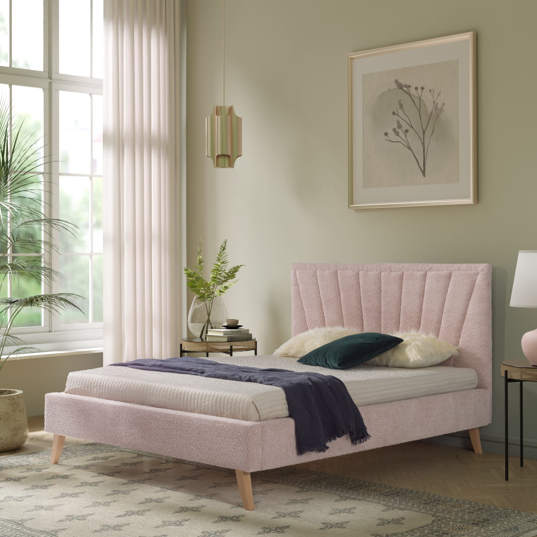 Łóżko tapicerowane Bella ze stelażem listewkowym.